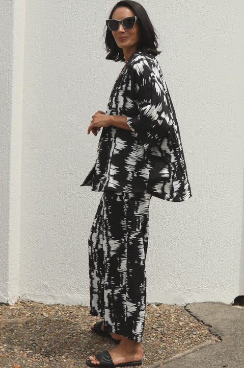 Campania Print—This abstract black and white print brings a fresh, artistic vibe to your wardrobe, making it a standout piece for any occasion. Enjoy effortless style and comfort with our Campania Print Pants. Featuring a straight-leg cut, elasticated waistband...
