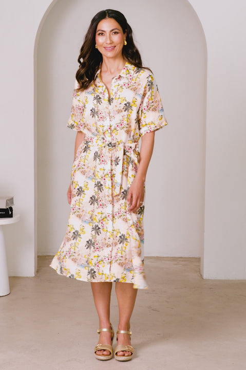 Positano Floral Mid Sleeve Collared Linen Midi Dress