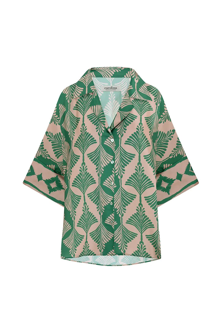 Tory Short Sleeve Collared Shirt Fan Print in Emerald & Espresso- Pre Order