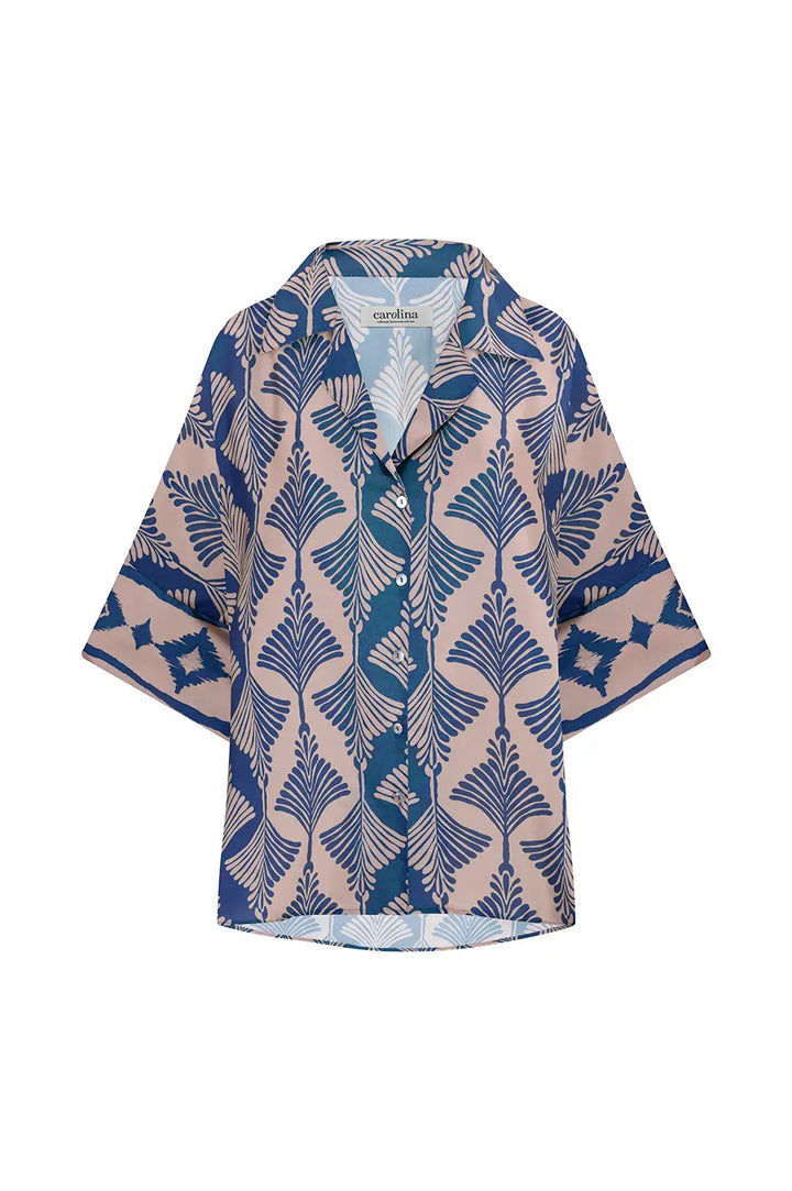 Tory Short Sleeve Collared Shirt Fan Print in Navy & Espresso- Pre Order